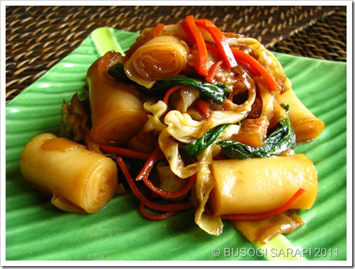 ~ Cook till the rolled rice noodles becomes soft and pliable. The noodles will absorb most of the liquid, remove from the wok into a large serving bowl.